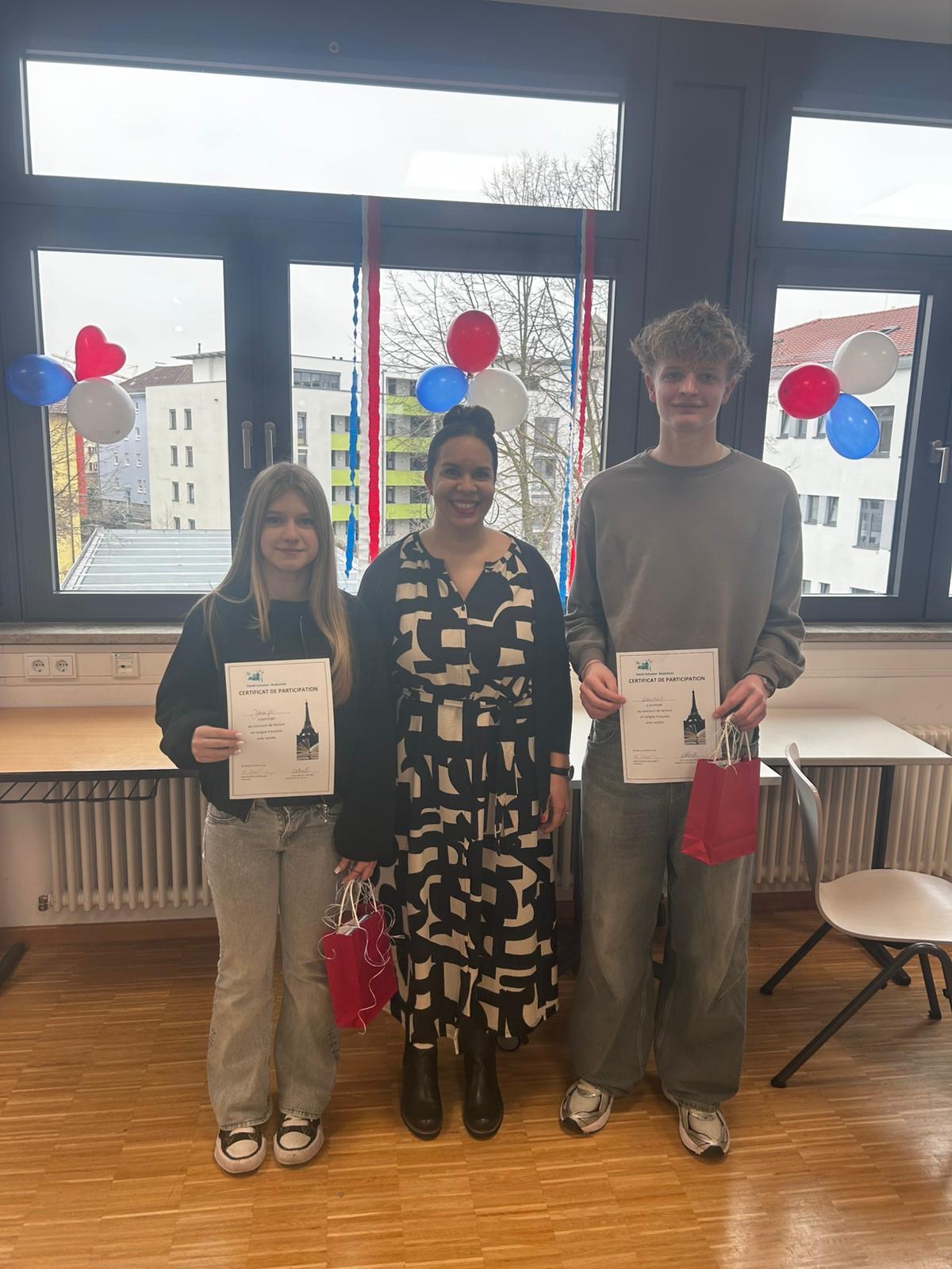 Besonders stolz sind wir auf Jennifer Felde und Laurent Mack aus der Klasse 9c. Beide qualifizierten sich erfolgreich als Klassenbeste und zeigten eine großartige Leistung. Mit viel Souveränität und Ausdrucksstärke lasen sie zunächst einen vorbereiteten, bekannten Text und anschließend einen unbekannten Auszug aus Arsène Lupin in französischer Sprache vor. Es war beeindruckend zu sehen, wie sicher und selbstbewusst unsere Schülerinnen und Schüler vor einem unbekannten Publikum auftraten.