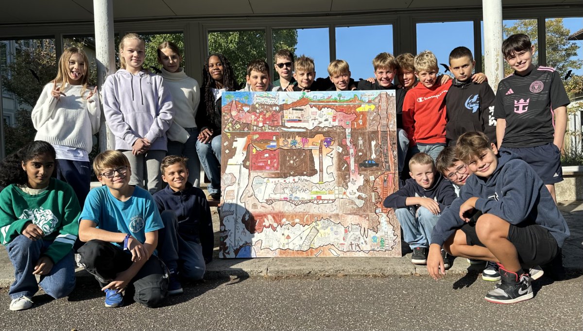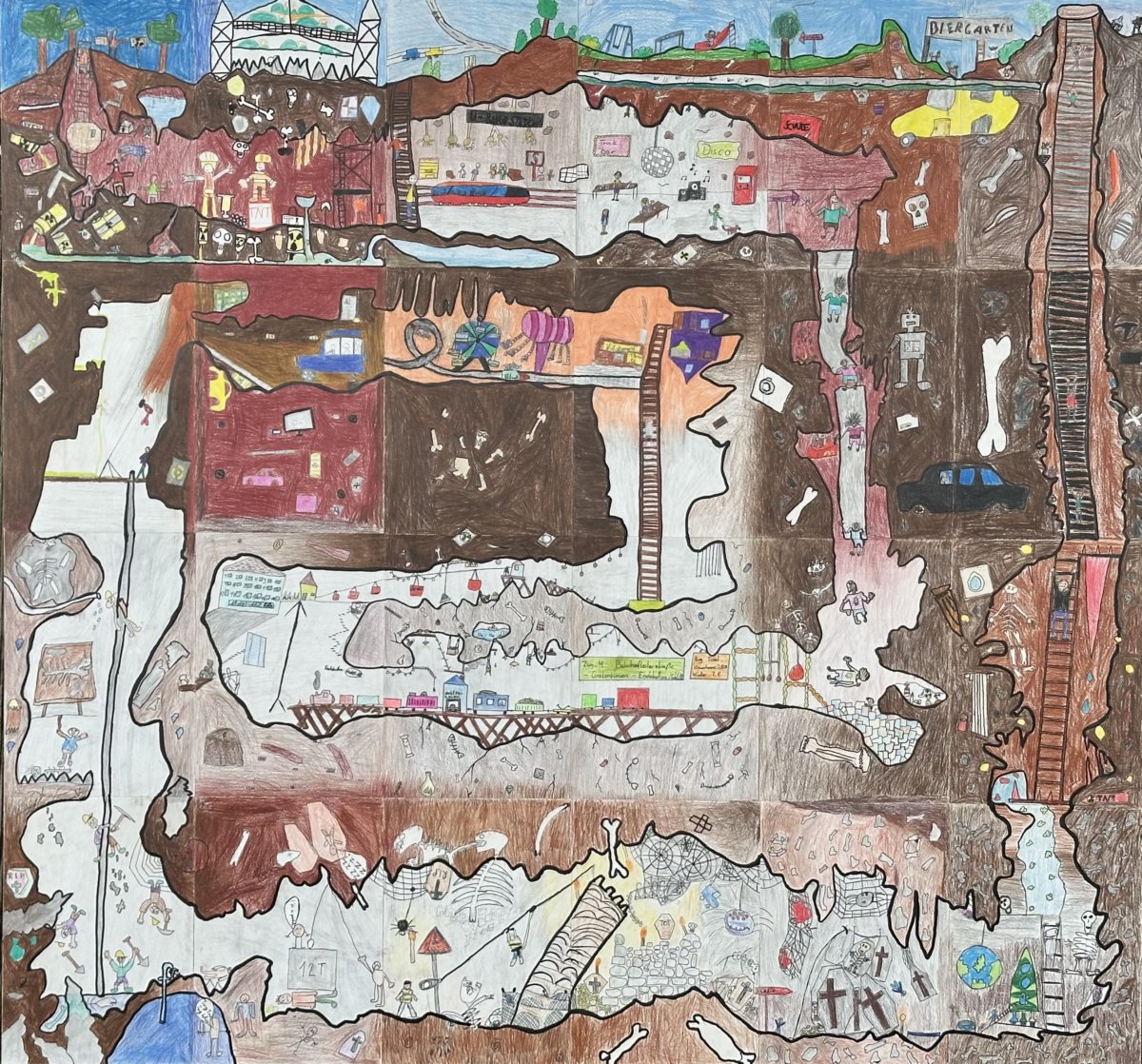 Die Schülerinnen und Schüler der Klasse 6a haben gegen Ende des letzten Schuljahres eine Gruppenarbeit in 24 Einzelbildern gemeinsam gestaltet. Thema des Projekts war „Schatzsuche unter der Erde“. Die Einzelbilder wurden zu einem riesigen Wimmelbild zusammengefügt, welches nun im Gang vor den Werkräumen ausgestellt ist. Wer Lust hat den Schatz zu suchen und die vielen überraschenden Details im Bild aufzuspüren, ist herzlich eingeladen das Gemeinschaftswerk genau zu betrachten.