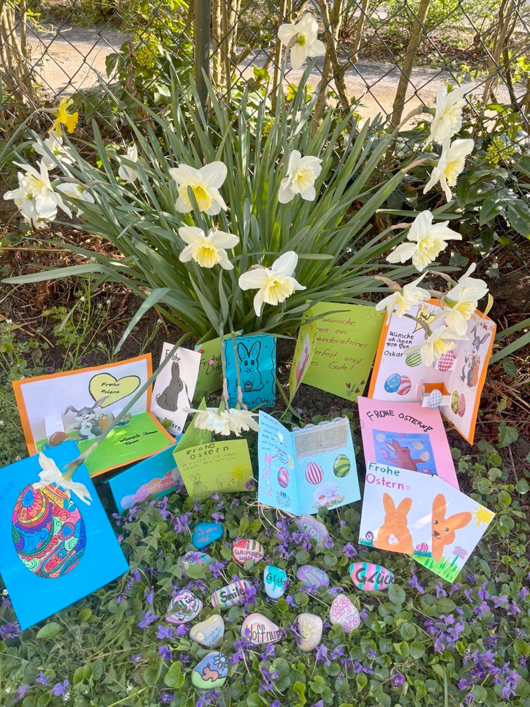 Noch bunter wurden die Ostergrüße durch die vielen selbst gestalteten Karten: Im evangelischen und katholischen Religionsunterricht wie auch im Ethikunterricht hatten Kinder aus allen Klassen farbenfrohe und persönliche Osterwünsche gestaltet, um Freude und Zuversicht zu verschenken.